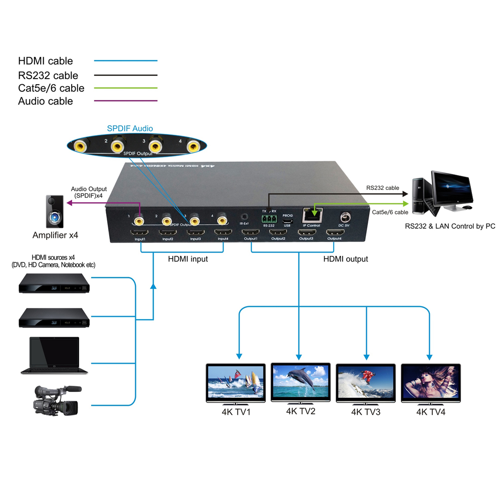 - This 4×4 HDMI matrix switch enables you to connect up to four HDMI sources to up to four HDMI displays. Any one of the four inputs can be displayed on any one of the four outputs. It is typically used to connect HDMI sources such as DVD players, Blu-ray players, satellite receivers or gaming systems to HDMI displays such as HDTVs, HD projectors or HDMI monitors.